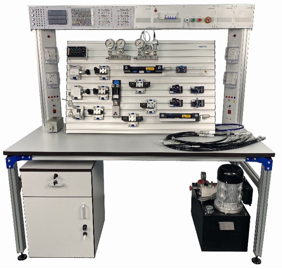 液压技术综合实训装置由液压元件、液压站、操作台、铝合金实训板以及配套设备所组成。